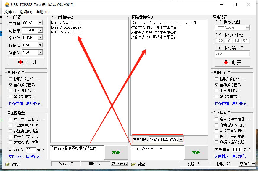 網絡端協議類型選擇TCp Server,本地Ip:172.16.14.58(此時路由器分配給pC的Ip),本地端口號:8234(可設)。具體數據測試如下:
