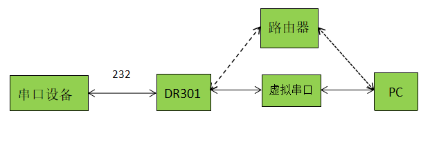 1、將301(USR-DR301,簡稱301)的串口通過串口線(或USB 轉串口線)與pC相連接,通過網線將串口服務器DR301的網口pC的網口相連接,檢測硬件連接無錯誤后,接入我們配送的電源適配器,給301供電。