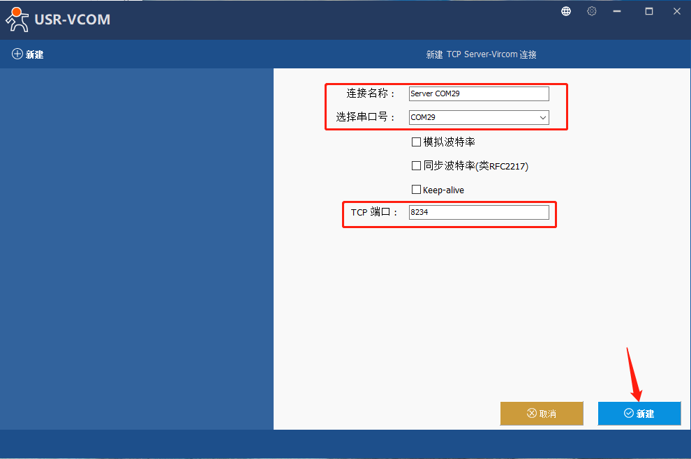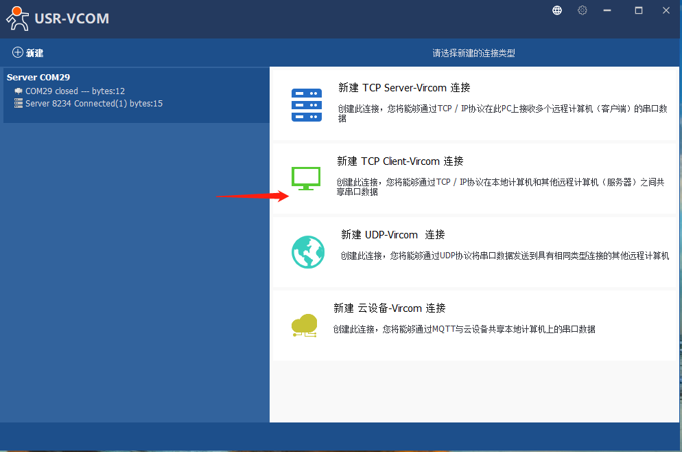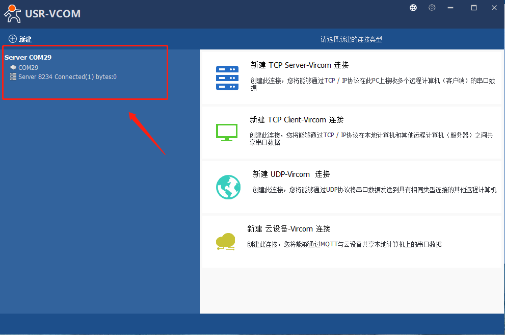 6、打開虛擬串口軟件,點擊“新建TCpServer-Vircom連接”,選擇新的串口號(為了避免串口沖突,盡量往大選),此處以COM29為例,TCp端口設為8234,點擊新建,可以看到自己剛剛創建的虛擬串口。