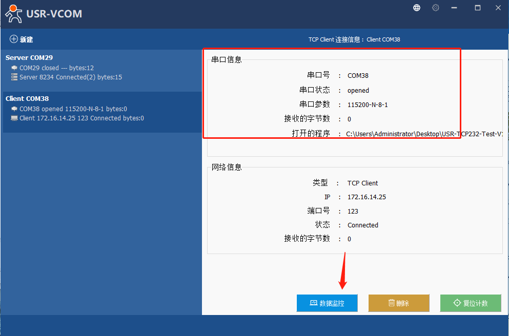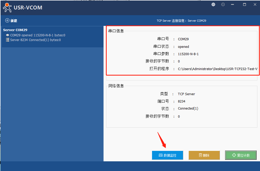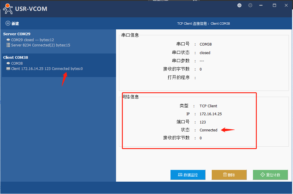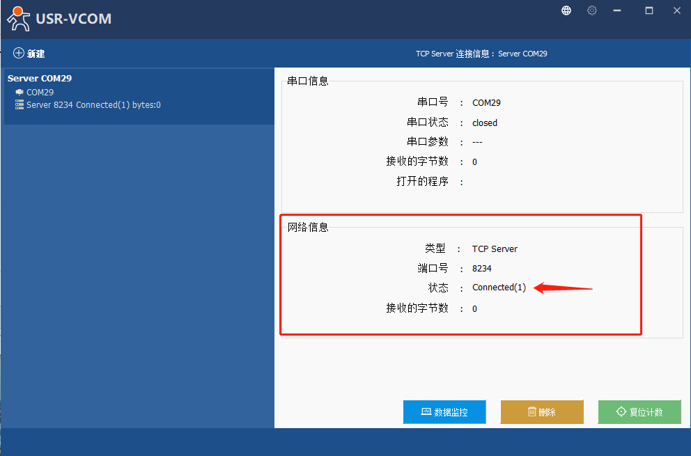 7、點擊新建立的虛擬串口,可以看到網絡信息狀態顯示Connected(1),代表已經建立連接。
