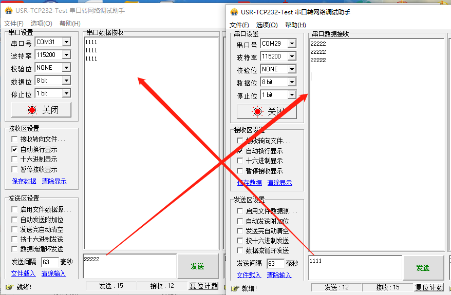 13、打開兩個串口調試助手軟件,串口端選擇正確的串口(設備插在電腦上所識別到的COM口可在設備管理器--端口處查看)以及串口參數,301出廠默認115200,N,8,1。打開創建的虛擬串口后,虛擬串口界面顯示串口信息為:Opened。