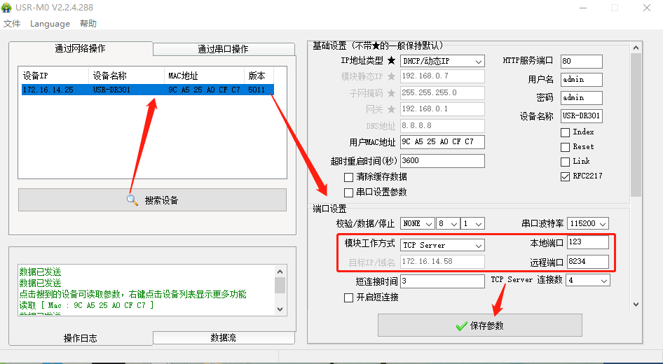 點擊“搜索設備”當搜索列表中出現301的設備后,單擊搜索到的設備,右邊基礎設置,在“Ip地址類型”將靜態Ip改為DHCp動態獲取,點擊保存參數。