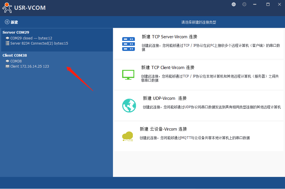 11、打開虛擬串口軟件,點擊“新建TCp Client-Vircom連接”,選擇新的串口號(為了避免串口沖突,盡量往大選),此處以COM38為例,遠程主機:172.16.14.25(路由器分配給301的Ip),遠程端口設為123,點擊新建,可以看到自己剛剛創建的虛擬串口。