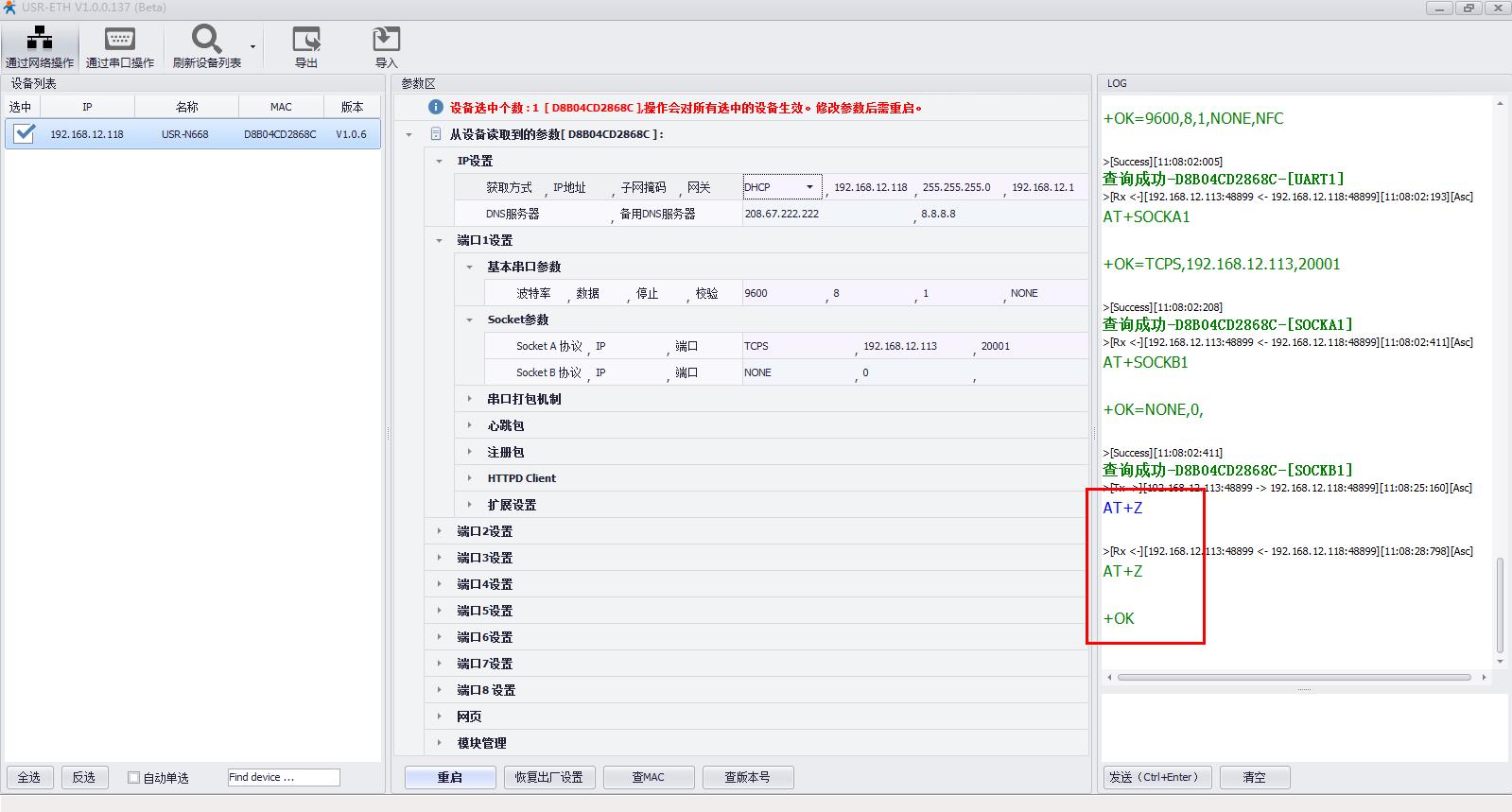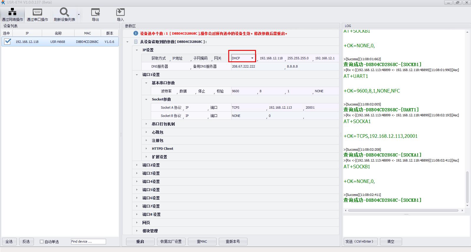 用N668設置軟件搜索USR-N668的IP,192.168.0.7,USR-N668用串口設置軟件設置DHCP,動態獲取IP。