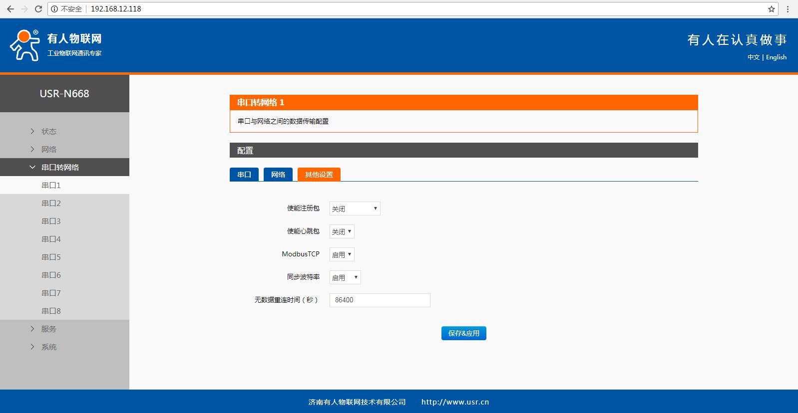 在瀏覽器輸入N668的IP,可以登錄N668的內置網頁。設置串口一參數工作方式TCP server 本地端口20001 開啟MODBUS TCP功能。網頁設置參數完成之后,重啟N668。