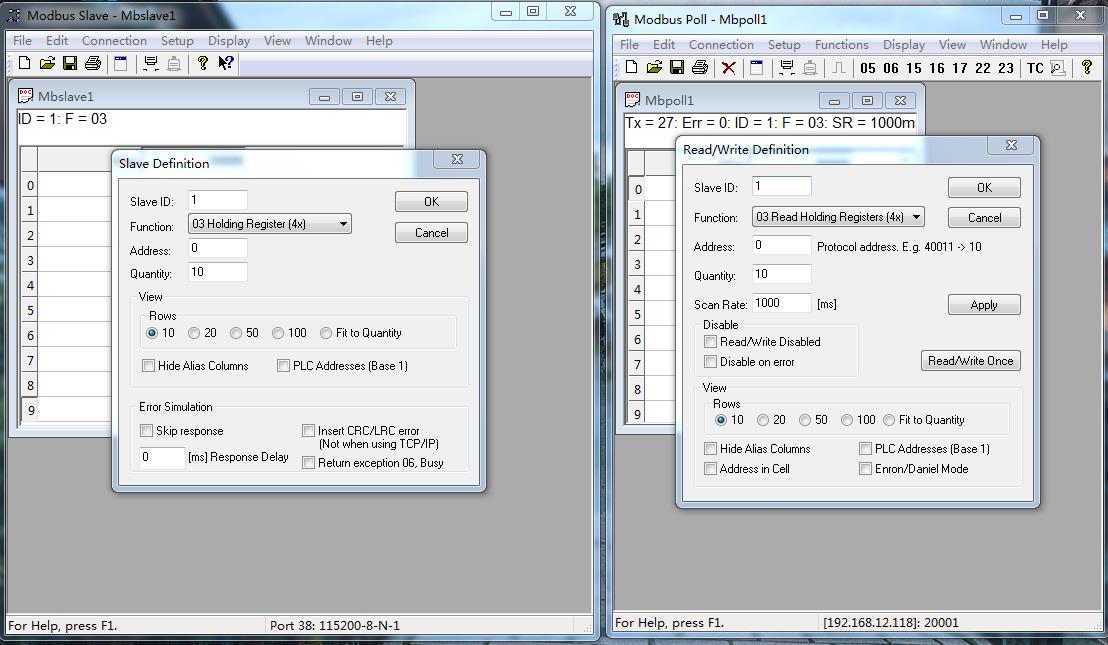 在電腦下載,并安裝打開MODBUS SLAVE和MODBUS POLL 軟件。軟件建立TCP連接,USB-RS232串口線接N668串口一和電腦,改變MODBUS SAVLE從機寄存器地址數據,對應MODBUS POLL 寄存器地址數據改變,就可以實現N668串口和網絡之間數據傳輸。