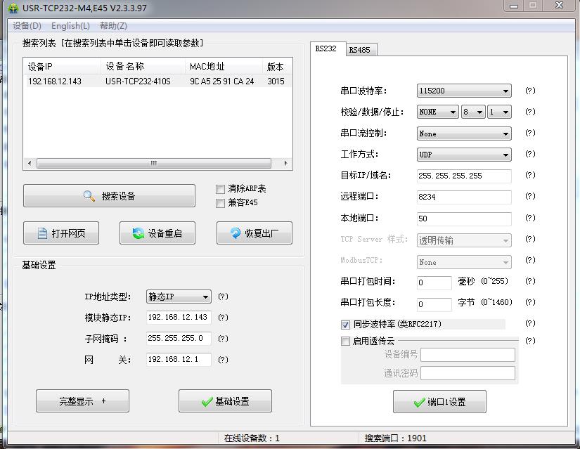 410S網(wǎng)口用網(wǎng)線接路由器,電腦也連接同一個路由器。用M4設(shè)置軟件搜索USR-TCP232-410S的IP 192.168.12.143