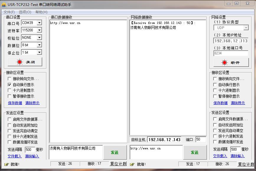 在電腦下載,并安裝打開USR-TCP232-TEST 串口網(wǎng)絡(luò)助手。建立UDP連接,USB-RS232串口線接第一個電腦,就可以實現(xiàn)410S串口和網(wǎng)絡(luò)之間數(shù)據(jù)傳輸。