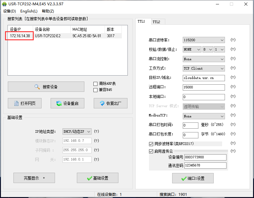用M4設置軟件搜索USR-TCP232-E2的Ip。確定動態獲取的Ip172.16.14.38
