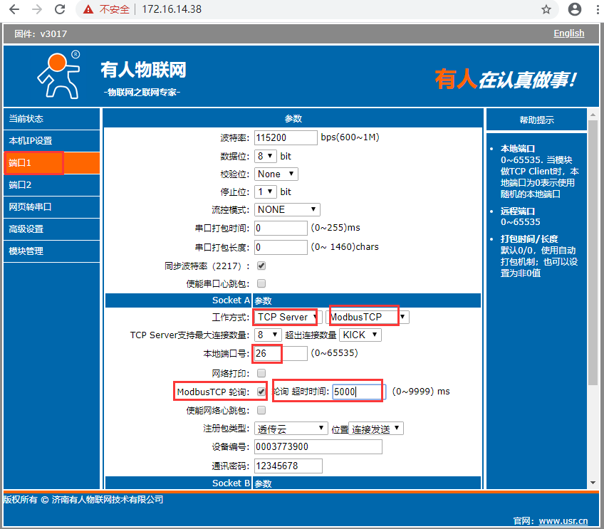 網頁檢查串口參數,工作方式設置TCP server ,開啟ModbusTCp,本地端口號默認是26,Modbus TCP輪詢默認是關閉,需要勾選開啟MODBUS TCP輪詢。