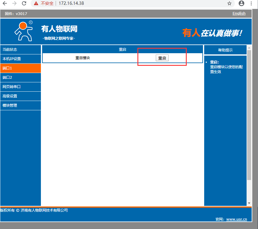 在電腦打開瀏覽器,輸入動態獲取的IP172.16.14.38 登錄USR-TCP232-E2的內置網頁。