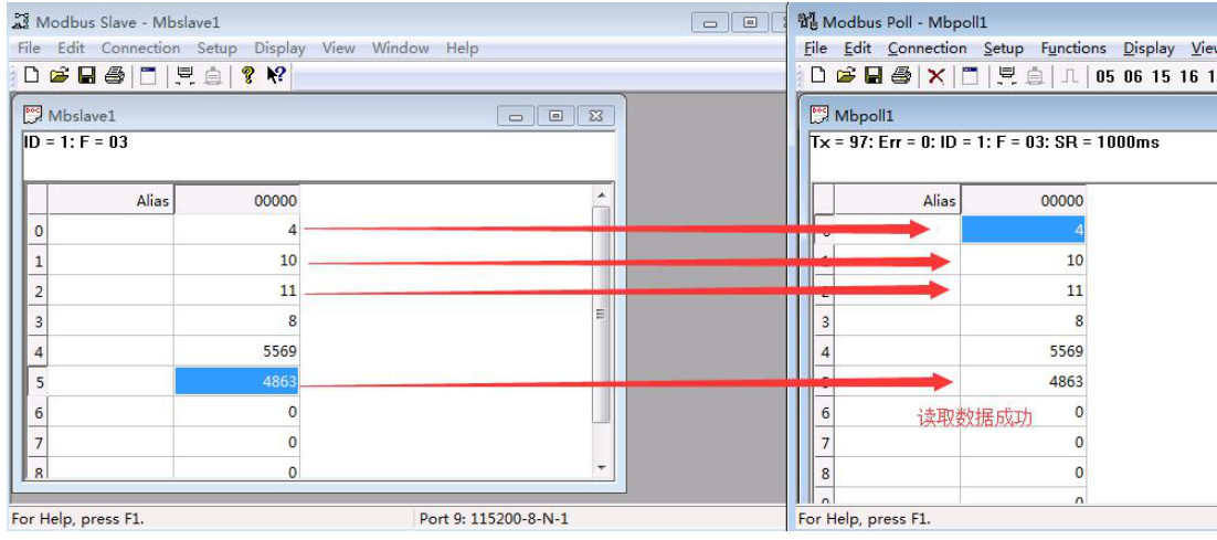 6.改變每個MODBUS SLAVE軟件的數據,對應的MODBUS POLL軟件就可以采集到正確的數據。