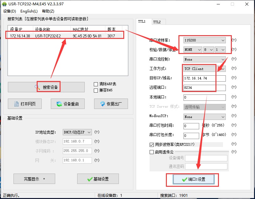 點擊“搜索設備”當搜索列表中出現E2的設備后,單擊搜索到的設備,查看其配置信息,工作方式選擇TCp Client,目標ip為pC的本地Ip:172.16.14.74,遠程端口為pC的本地端口號:8234,點擊端口設置保存參數。