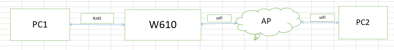USR-W610(以下簡稱W610)接上供電電源,此時power指示燈亮起;將雙網口wifi串口服務器W630的網口通過網線連接電腦(pC1),pC2先連接W610的wifi,進入內置網頁配置參數,然后連接同一WiFi,和W610處于同一局域網