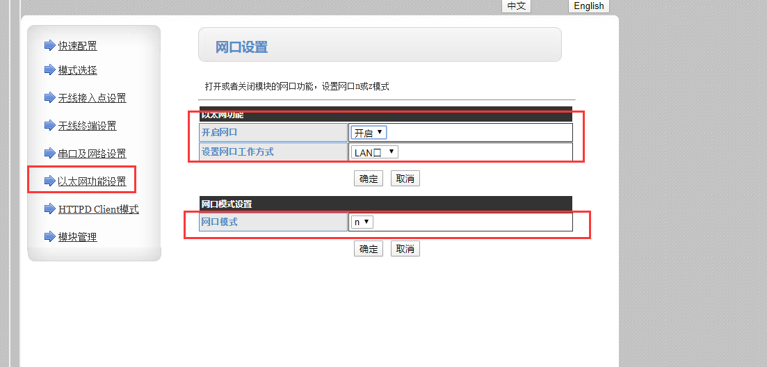 5.以太網功能設置:開啟網口,選擇LAN口,點擊確定,網口模式選擇路由(n),點擊確定