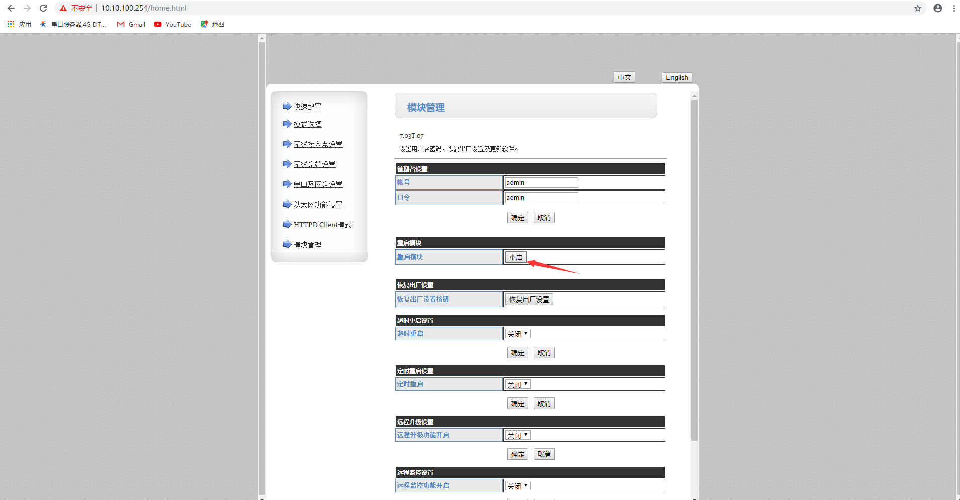 2.瀏覽器輸入10.10.100.254進入內置網頁,登錄的賬號和密碼是admin和admin