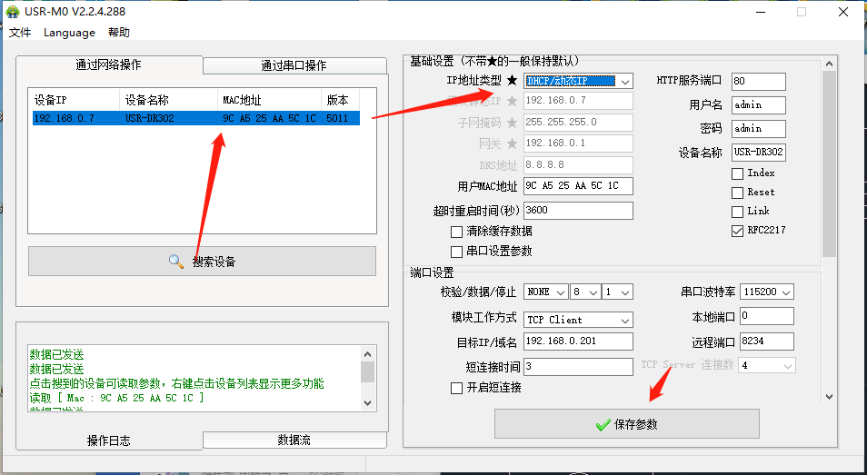 點擊“搜索設(shè)備”當搜索列表中出現(xiàn)302的設(shè)備后,單擊搜索到的設(shè)備,右邊基礎(chǔ)設(shè)置,在“Ip地址類型”將靜態(tài)Ip改為DHCp動態(tài)獲取,點擊保存參數(shù)。