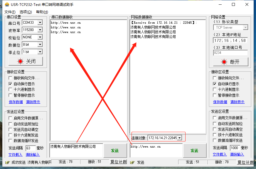 網(wǎng)絡(luò)端協(xié)議類型選擇TCp Server,本地Ip:172.16.14.58(此時路由器分配給pC的Ip),本地端口號:8234(可設(shè))。具體數(shù)據(jù)測試如下: