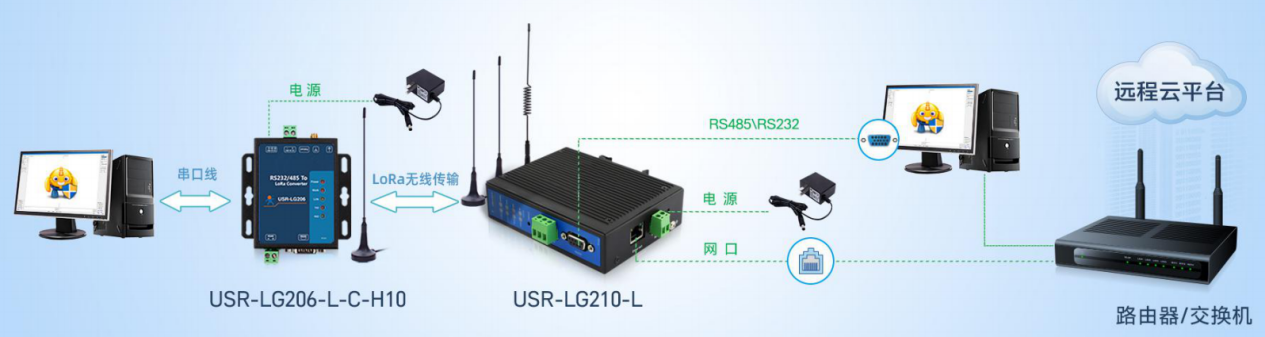 lora網(wǎng)關(guān)LG210與lora節(jié)點(USR-LG206-L-C-H10)安裝天線,使用各自配套電源適配器供電,lora網(wǎng)關(guān) LG210與lora無線終端LG206串口連接電腦,LG210網(wǎng)口連接路由器或者交換機,電腦也接入該路由器或交換機。