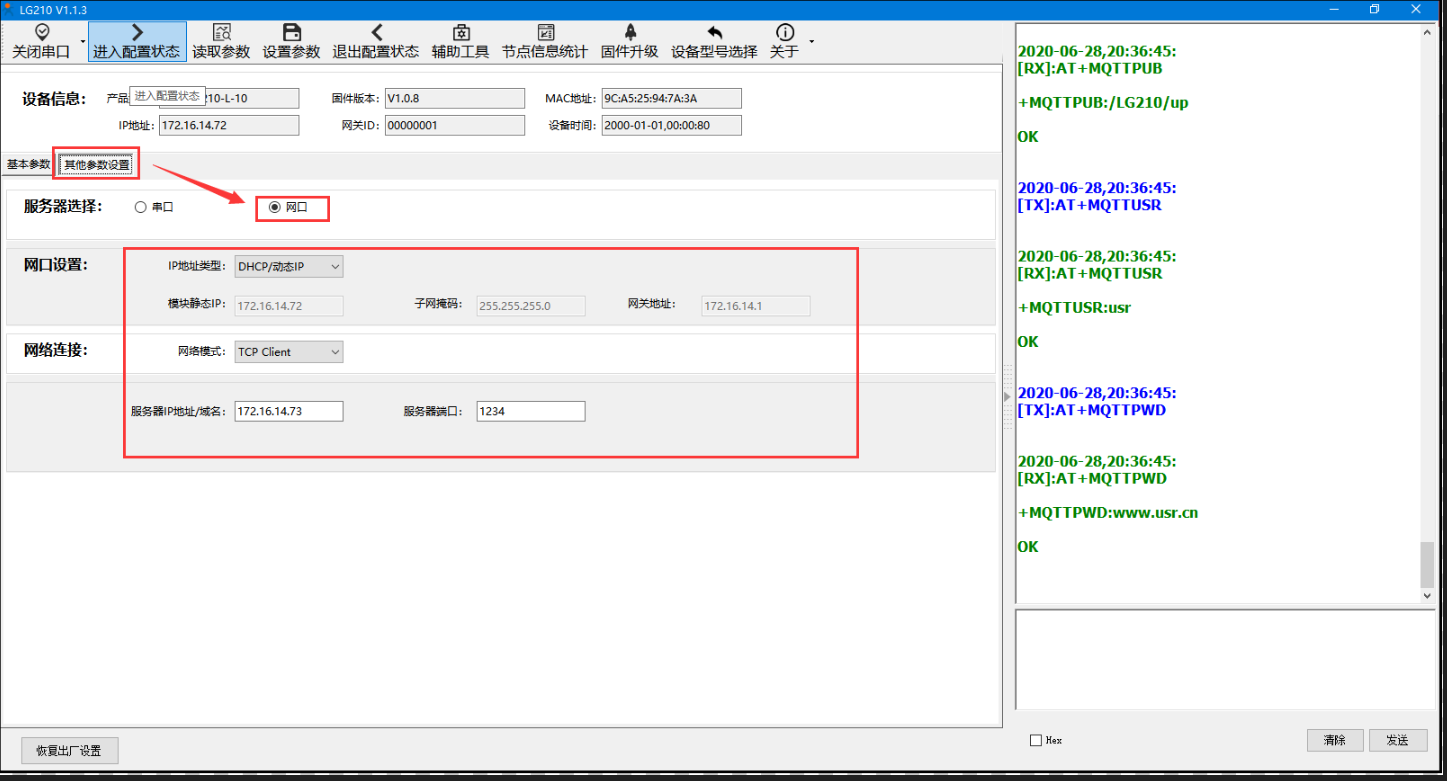 點擊“其他參數(shù)配置”,服務(wù)器選擇:“網(wǎng)口”。