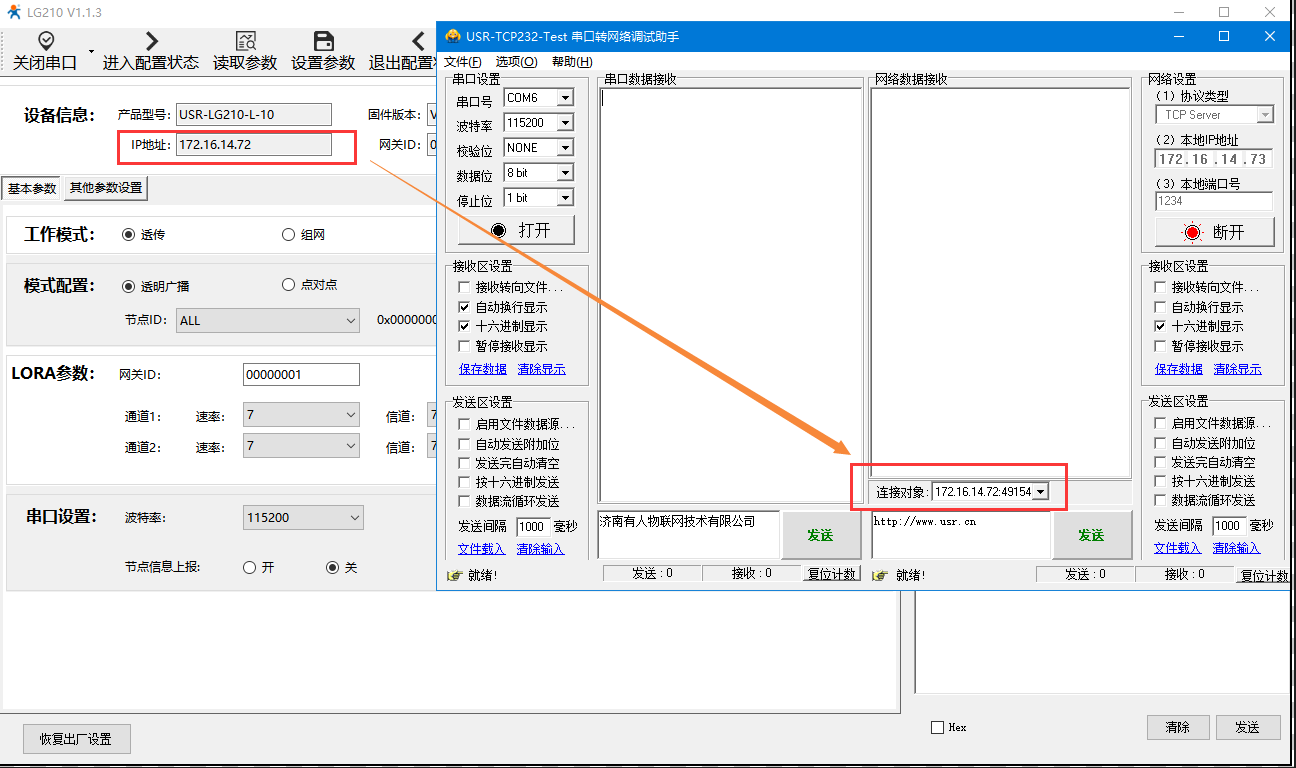 在USR-TCp232-Test軟件的串口端打開206的串口, 互發(fā)數(shù)據(jù)便可通信了。