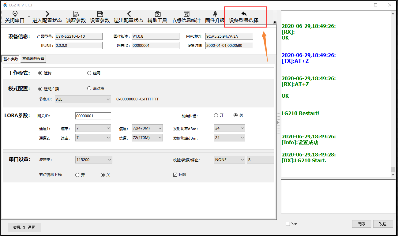 7) 配置LORA節(jié)點USR-LG206-L-C-H10,設(shè)置軟件設(shè)備選型選擇”LG206-L-p-H10”。