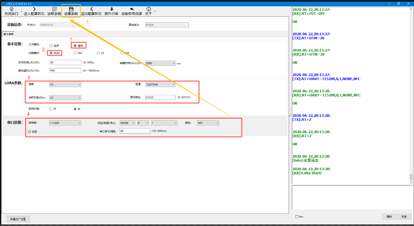 A、打開LoRa設置軟件(產品型號選擇為L101-L-p-H10),依次點擊打開串口(選擇A、B對應的串口號,串口參數:115200,None,8,1,NFC)、進入配置狀態、讀取參數、配置上表中的參數、一鍵設置所有參數,關閉LoRa設置軟件。