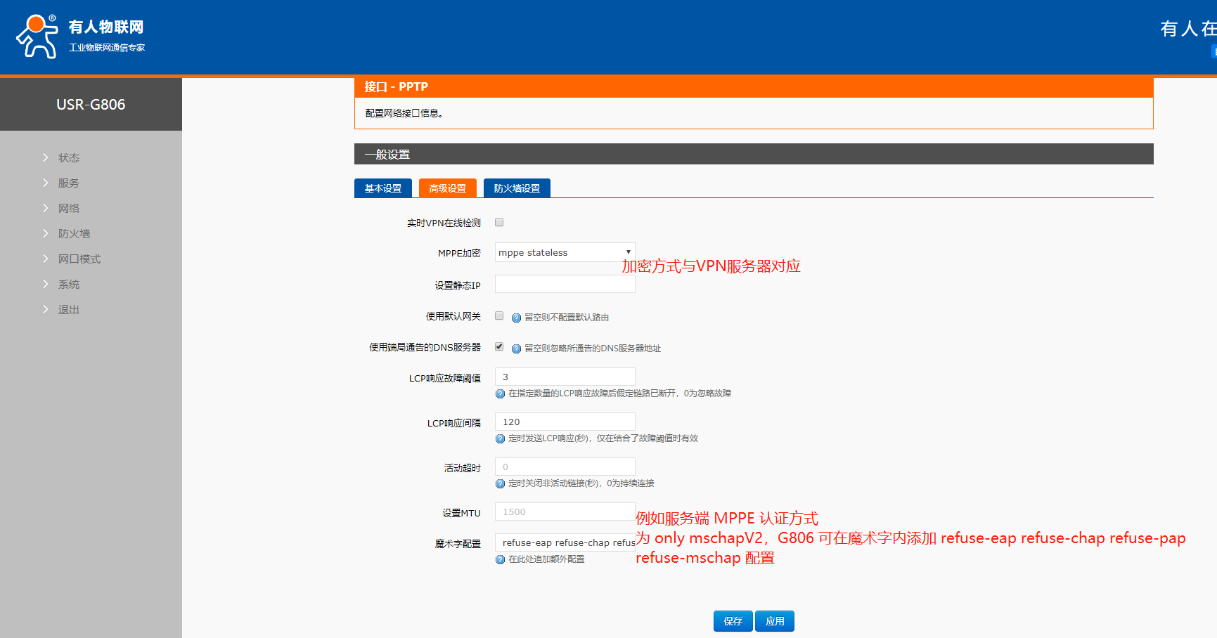 4、高級設置中加密方式與VPN服務器對應,其中加密方式可選:mppe stateful有狀態連接:會進行頻繁更換密鑰,且在更換密鑰時會出現嚴重丟包;mppe stateless無狀態連接:只有在丟包的時候會進行密鑰更改;no mppe服務端無 MPPE 加密方式時選擇此模式。魔術字:當以上配置不滿足配置文件和服務端向匹配時在此添加附加配置。例如服務端 MPPE 認證方式 為 only mschapV2,G806 可在魔術字內添加 refuse-eap refuse-chap refuse-pap refuse-mschap 配置