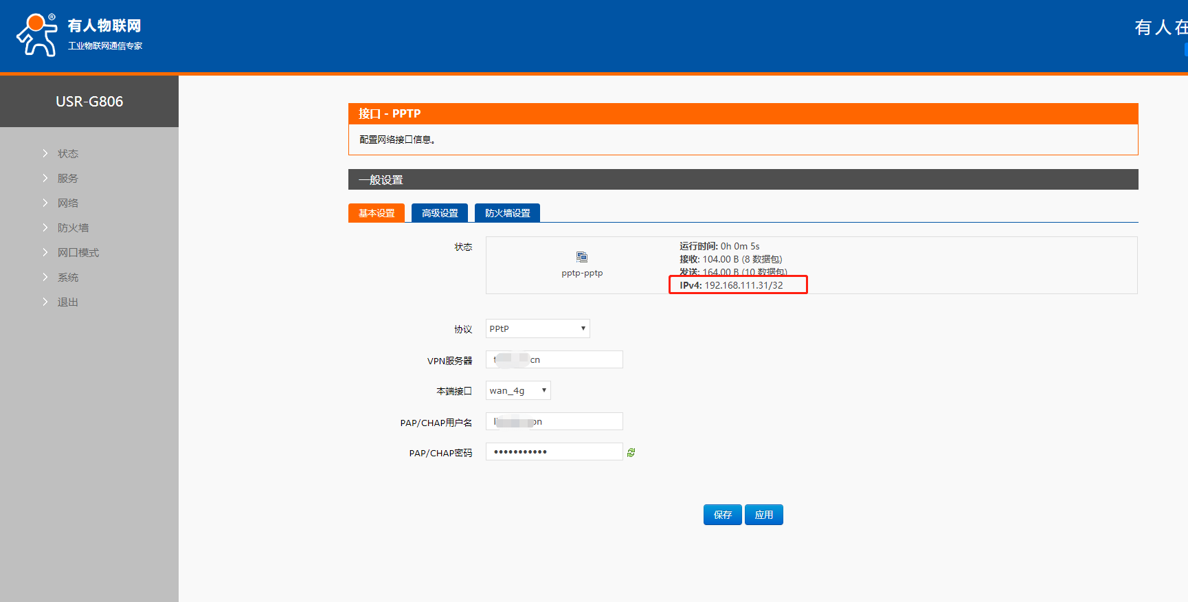 USR-G806:采用 4G 接口連接外網,創建 PPTP 接口連接 VPN;