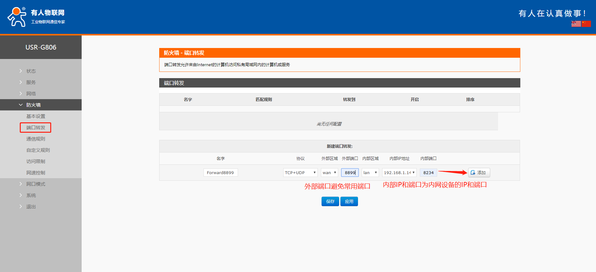 在內置網頁防火墻,端口轉發界面進行設置。內部IP和端口設置為內網設備的IP和端口,外部端口設置要避免常用端口。