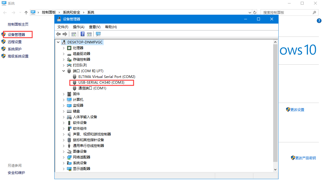 其中串口號可以在電腦的“設備管理器”中查看,見下圖;