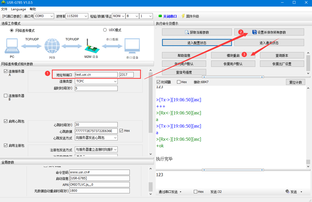 4)DTU出廠默認連接的是我司的測試服務器:test.usr.cn:2317;串口向服務器發送什么數據,服務器就將接收到的數據返回到串口。