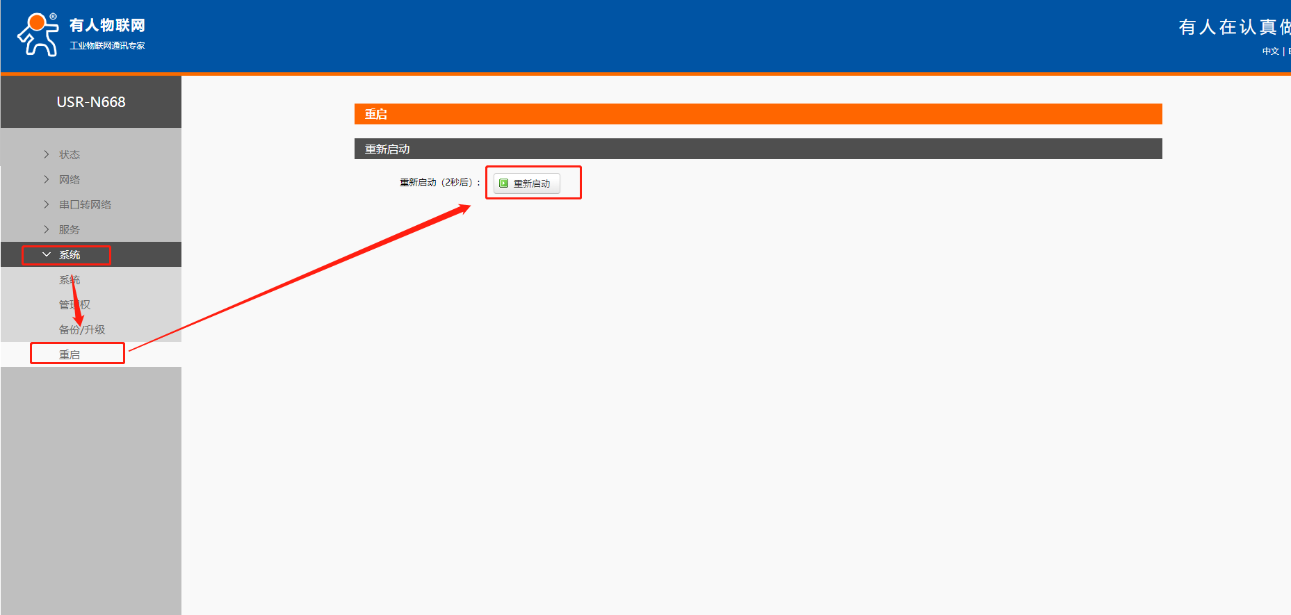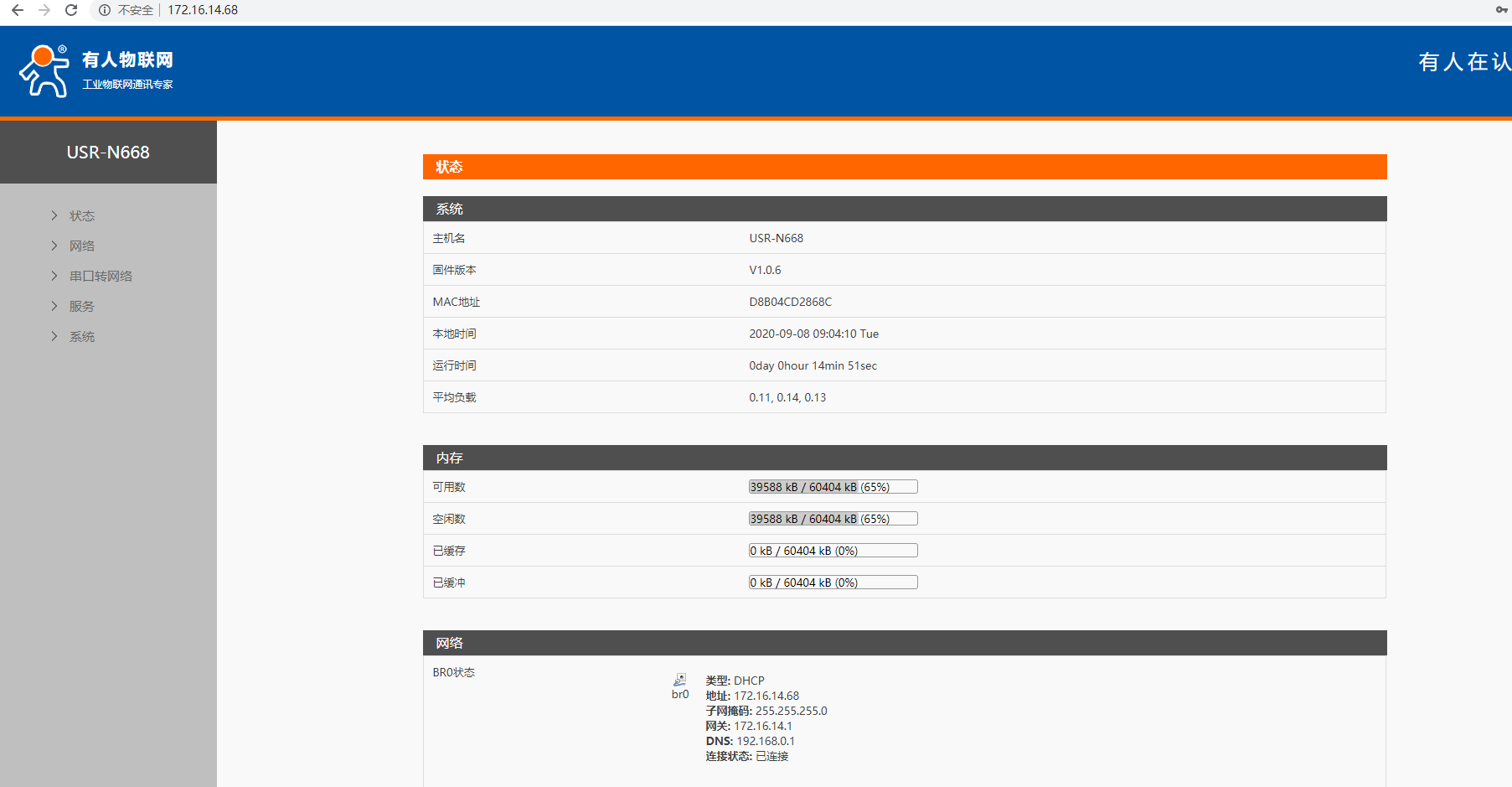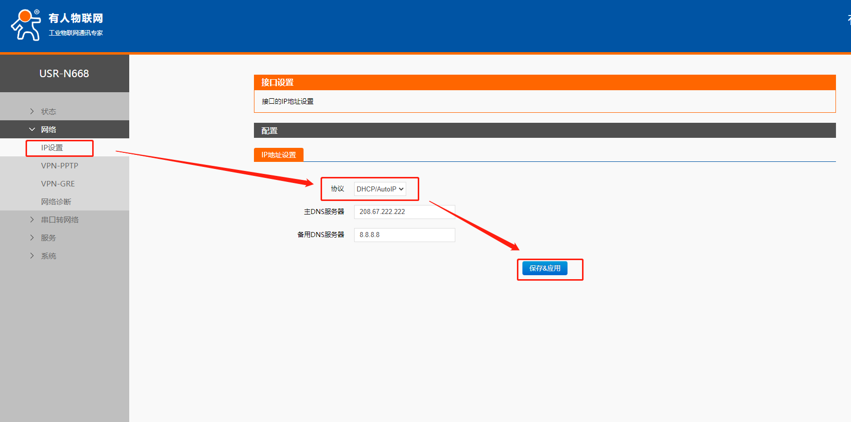 6. 完成重啟后,此時的N668使用的是路由器分配的IP,這時將電腦連接N668的網(wǎng)線連接同一路由器,使電腦與N668都使用路由器分配的IP,且都存在于同一網(wǎng)段。可以從路由器中獲取N668當前IP,通過此IP進入內置網(wǎng)頁,或者通過設置軟件搜索當前N668IP。通過新IP進入內置網(wǎng)頁。