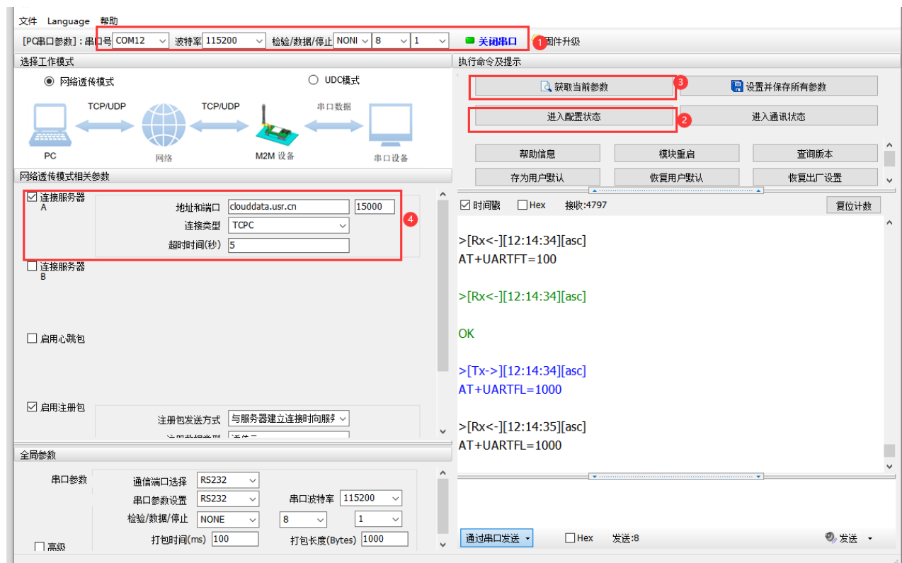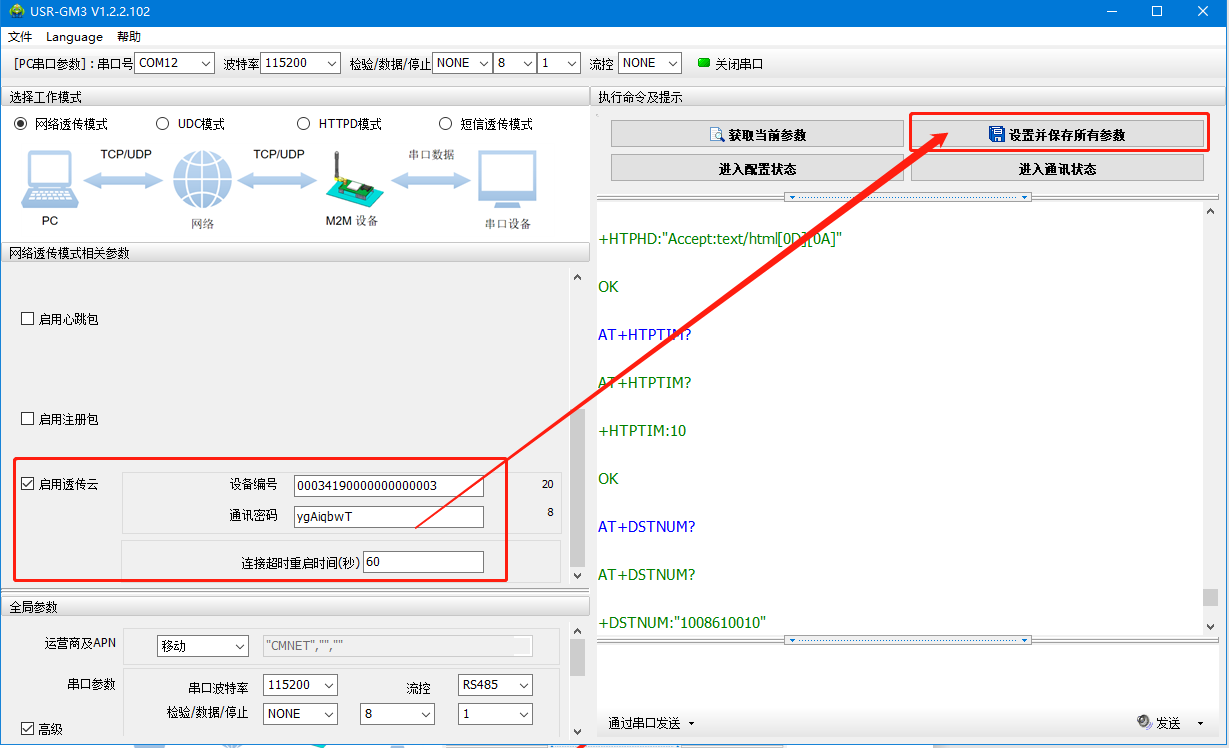 6、啟用注冊包類型選擇透傳云,設備編號和通信密碼為在云平臺添加設備生成的設備編號和通信密碼,點擊確定設置所有參數。