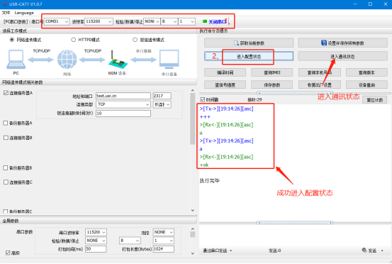 4、點擊進(jìn)入配置狀態(tài)返回+++ a a+ok是正確進(jìn)入配置狀態(tài)