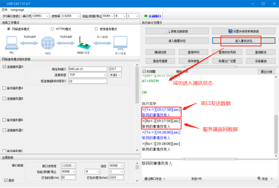 2、DTU出廠默認(rèn)連接的是我司的測試服務(wù)器:test.usr.cn:2317;串口向服務(wù)器發(fā)送什么數(shù)據(jù),服務(wù)器就將接收到的數(shù)據(jù)返回到串口。