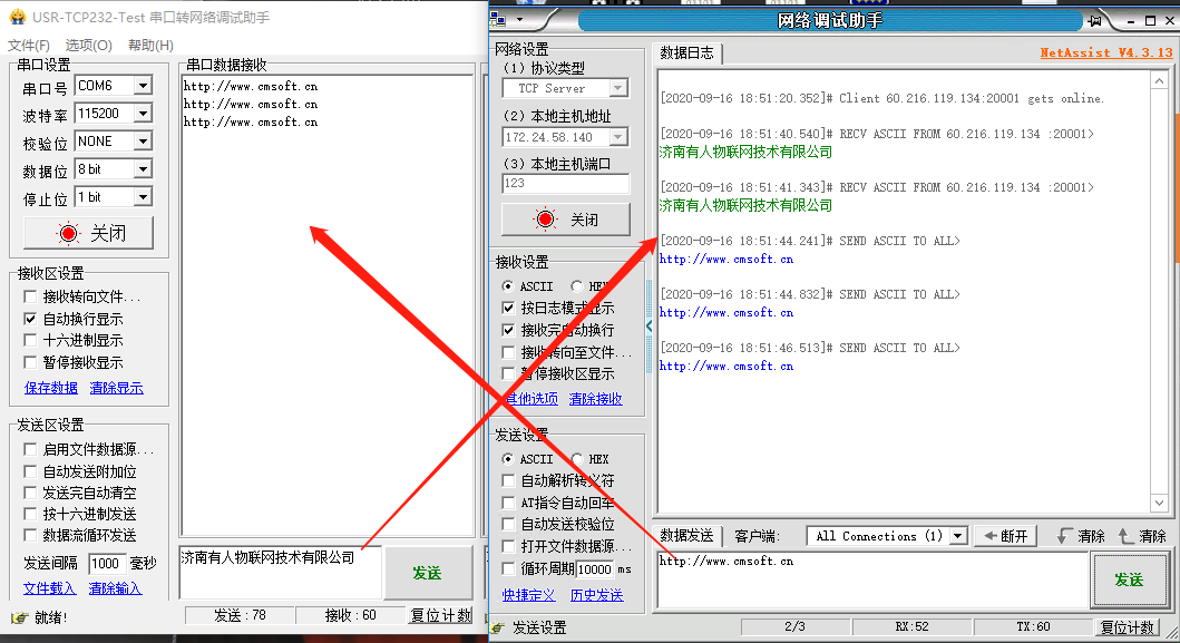 11、在串口和網絡之間進行數據收發測試,串口到服務器的數據流向是:PC串口->668串口->668以太網口->服務器;服務器到串口的數據流向是:服務器->668以太網口->668串口->PC串口。具體演示如下圖所示: