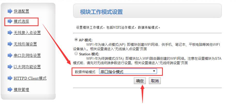 2、電腦瀏覽器地址欄輸入模塊默認IP:10.10.100.254,賬號和密碼都是admin,進入內(nèi)置網(wǎng)頁,模式選擇 -> 數(shù)據(jù)傳輸模式 -> 串口指令模式,點擊確定,串口及網(wǎng)絡(luò)設(shè)置 -> 網(wǎng)絡(luò)參數(shù)設(shè)置 -> 網(wǎng)絡(luò)模式配置為client,點擊確定,重啟模塊。