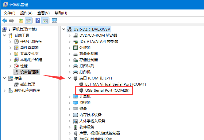 4、在設(shè)備管理器中查看端口信息,確定W610串口使用的串口號,如下圖所示電腦端口號為COM29.