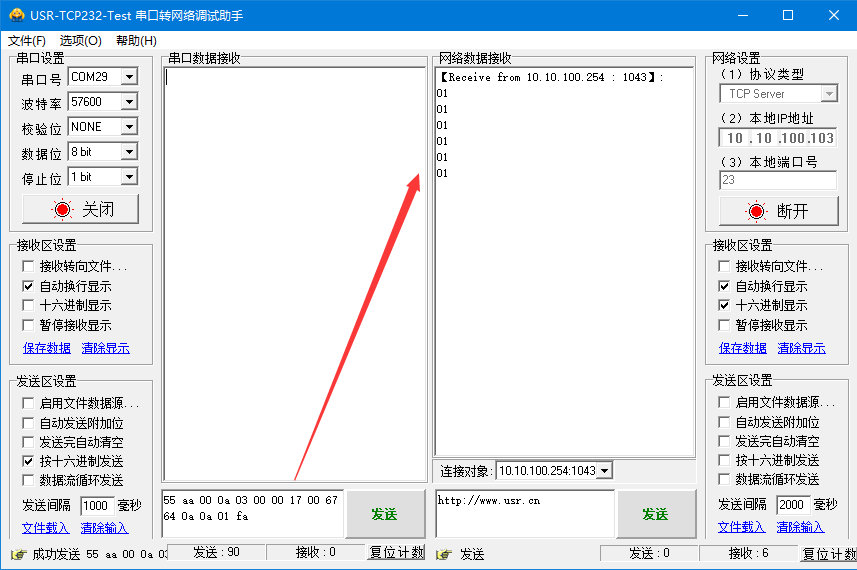 7、依據(jù)協(xié)議確定要往服務(wù)器發(fā)送有效數(shù)據(jù):01。