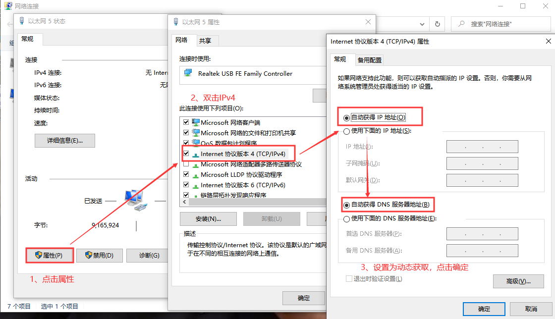電腦配置網(wǎng)卡,雙擊連接806的網(wǎng)卡選擇屬性,雙擊IPv4進入配置界面,勾選動態(tài)獲取之后點擊確定