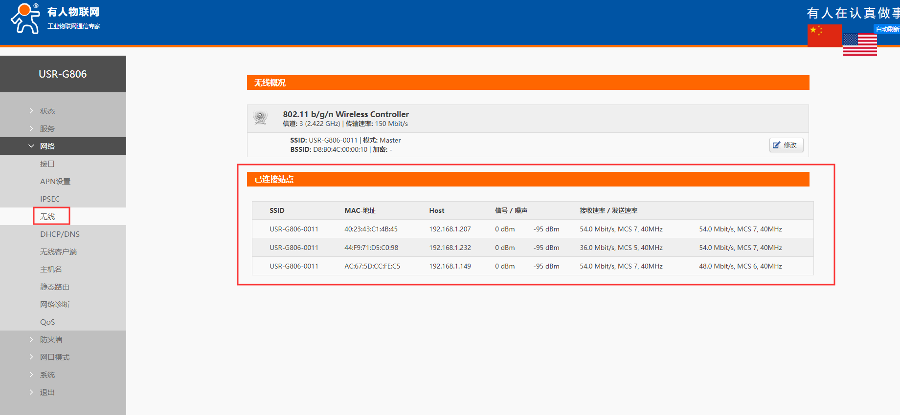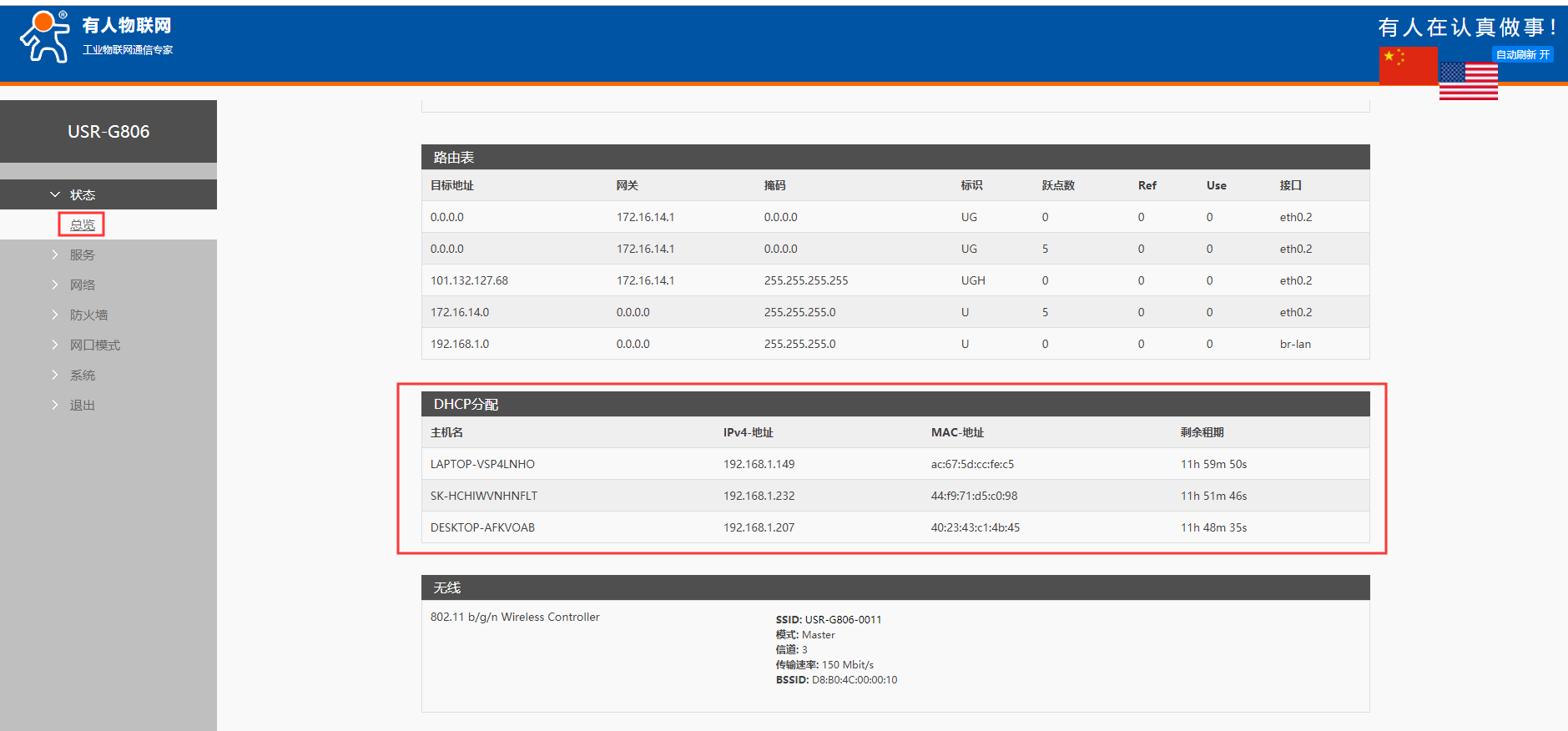 4.在內(nèi)置網(wǎng)頁中看一下接入設(shè)備動態(tài)獲取到的IP和MAC,可以在狀態(tài)總覽界面看到DHCP分配部分,以及字啊網(wǎng)絡--無線--已連接站點中查看