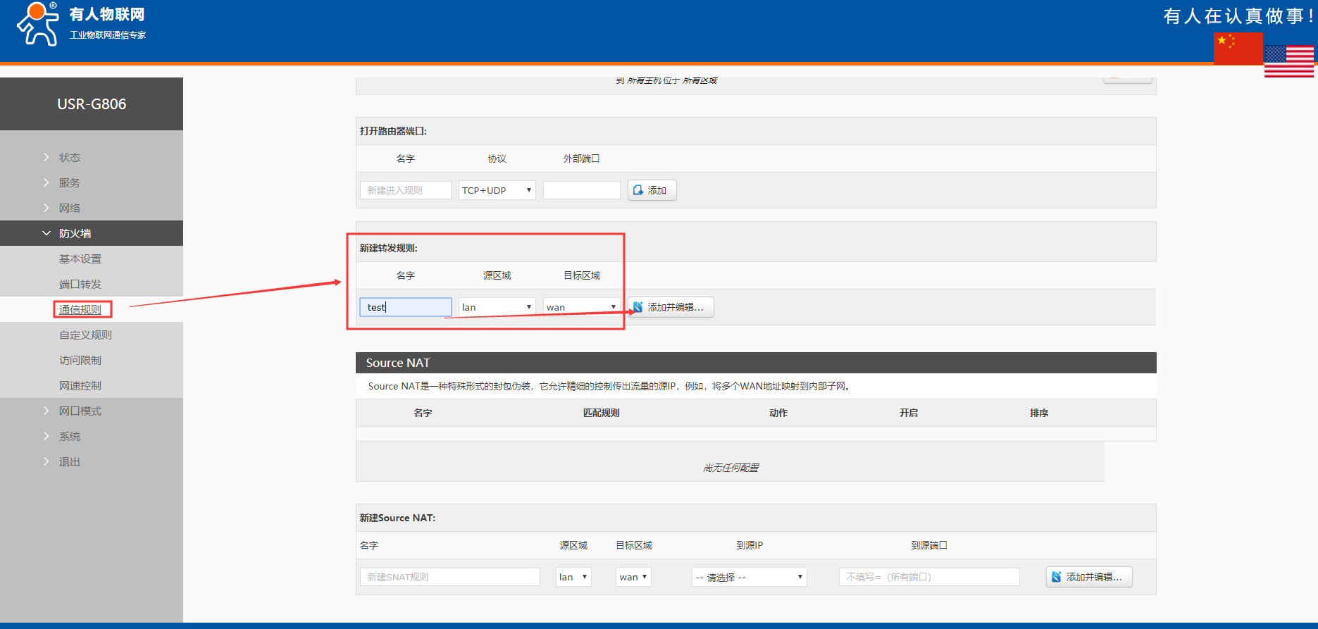 6.在跳轉(zhuǎn)的頁面中,源區(qū)域選擇lan,源 MAC 地址和源地址選擇想要禁用設(shè)備的IP和MAC(如果是想禁用806LAN口下級的所有設(shè)備訪問外網(wǎng),可以選擇全部)。設(shè)置的設(shè)備IP和MAC要保持一致,也就是要是同一個設(shè)備