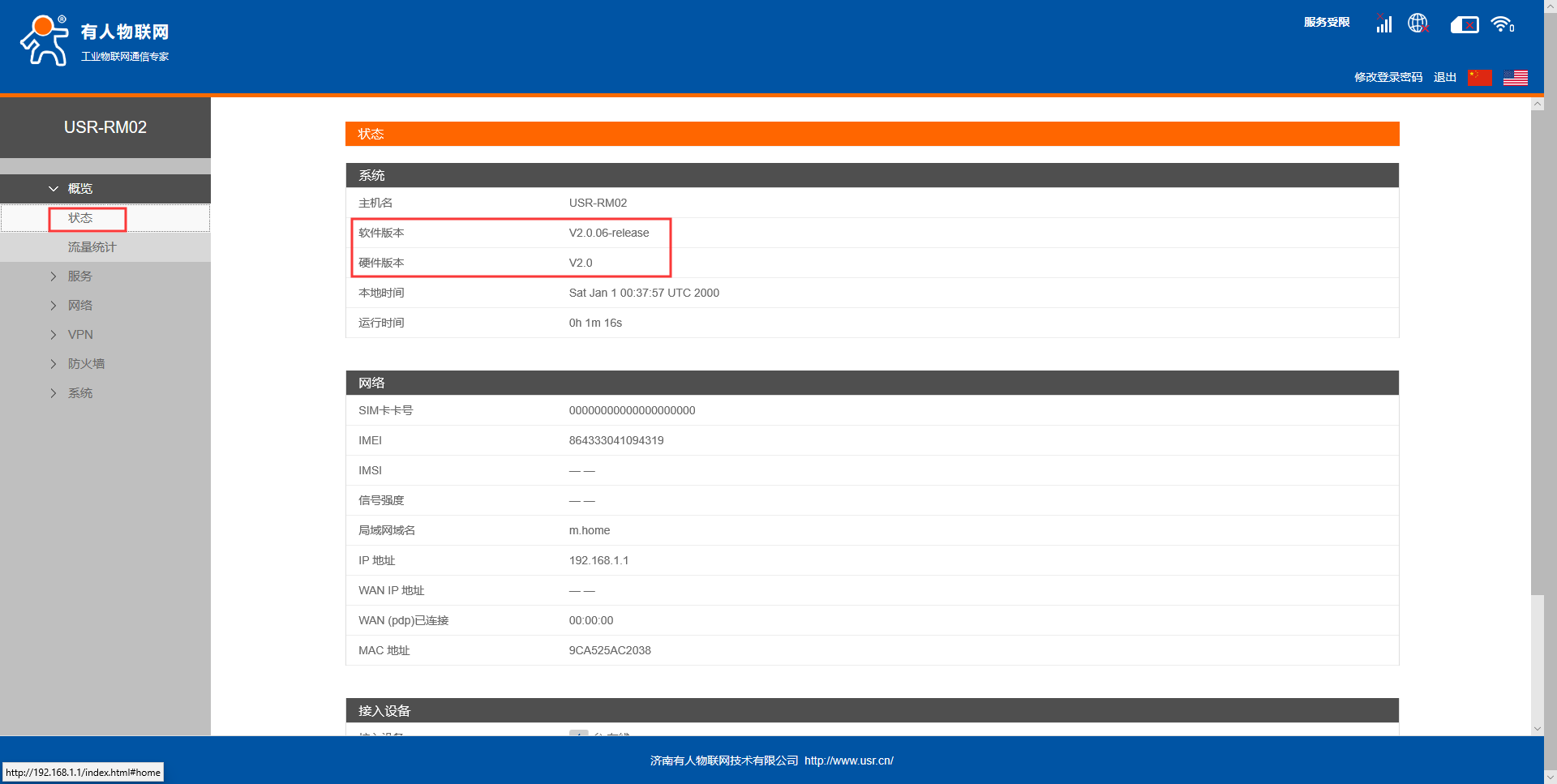 4.在概述--狀態界面可以看到硬件版本V2.0,軟件版本號為2.0.6-release,現在將模塊固件升級為2.0.7-release
