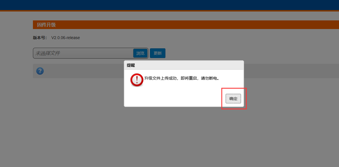 7.文件上傳成功后,會收到模塊即將重啟的提示,點擊確定。在升級過程中請勿關閉電源。(升級過程中設備斷電會造成死機,無法使用)