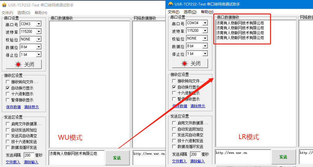 啟動兩個USR-TCP232-Test(模擬串口設備1,2)分別連接LoRa數傳終端A(com3)、B(com34)的串口,使用WU設備發送數據LR設備可接收數據,通信效果如下圖所示: