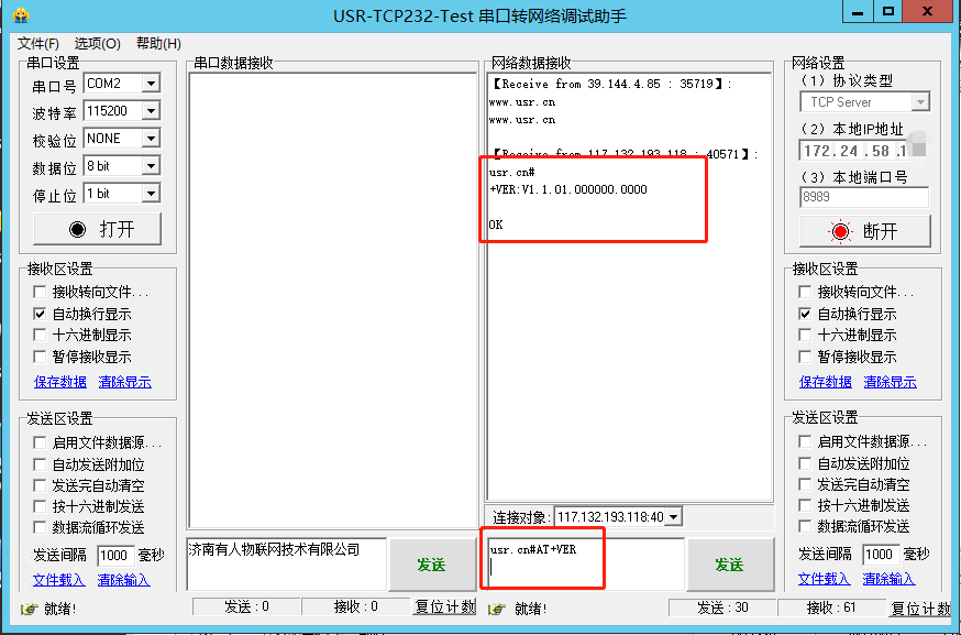 (4)查詢版本:在串口發送usr.cn#AT+VER+回車換行 可以看到模塊返回固件版本號