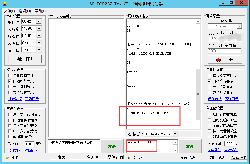 (7)更改以后發送usr.cn#AT+S+回車換行 重啟以后參數保存成功;然后重新建立連接以后查詢串口參數,可以看到串口波特率已經變為9600