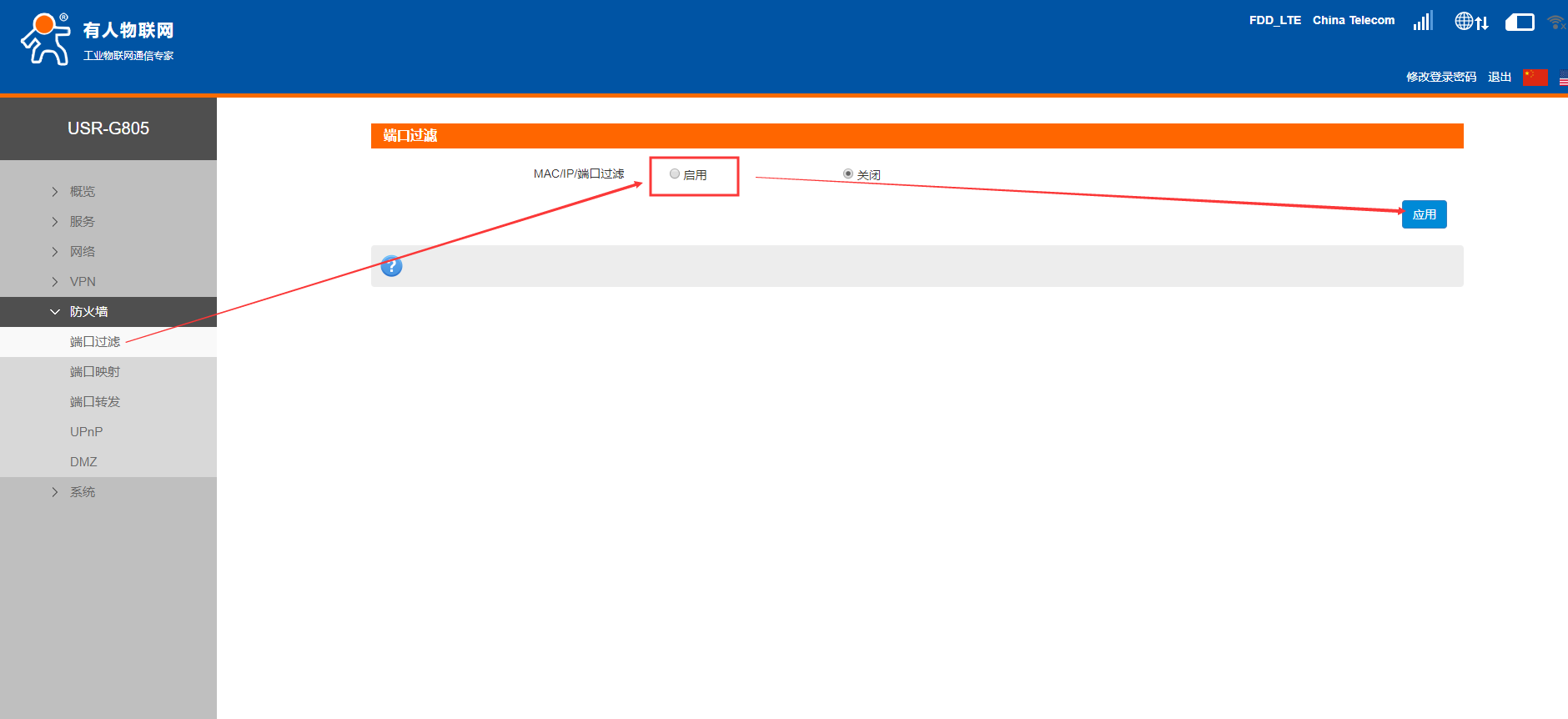 4. 在內(nèi)置網(wǎng)頁--防火墻中端口過濾界面進(jìn)行設(shè)置,啟用此功能之后點擊應(yīng)用。