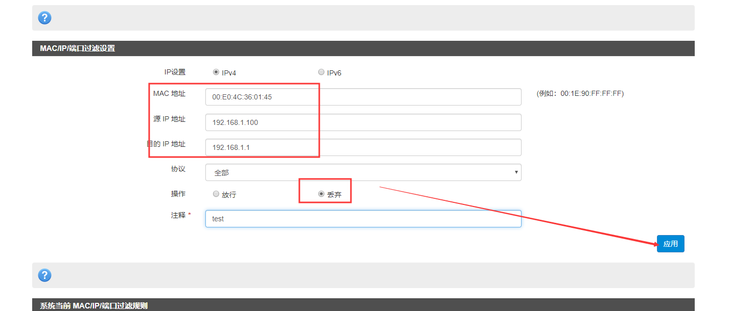 5.MAC和源IP地址設(shè)置連接805 的下級終端的MAC和IP,目標(biāo)IP設(shè)置禁止訪問的IP,協(xié)議選擇全部,操作設(shè)置丟棄。